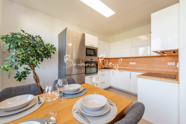 Pronajímá se s kuchyňskou linkou, komodou pod TV a vestavěnou skříní v chodbě i v ložnici. Kuchyňská linka je vybavena vestavěnou myčkou, mikrovlnnou troubou, elektrickou troubou, indukční varnou deskou a digestoří. Okna disponují vnitřními žaluziemi.